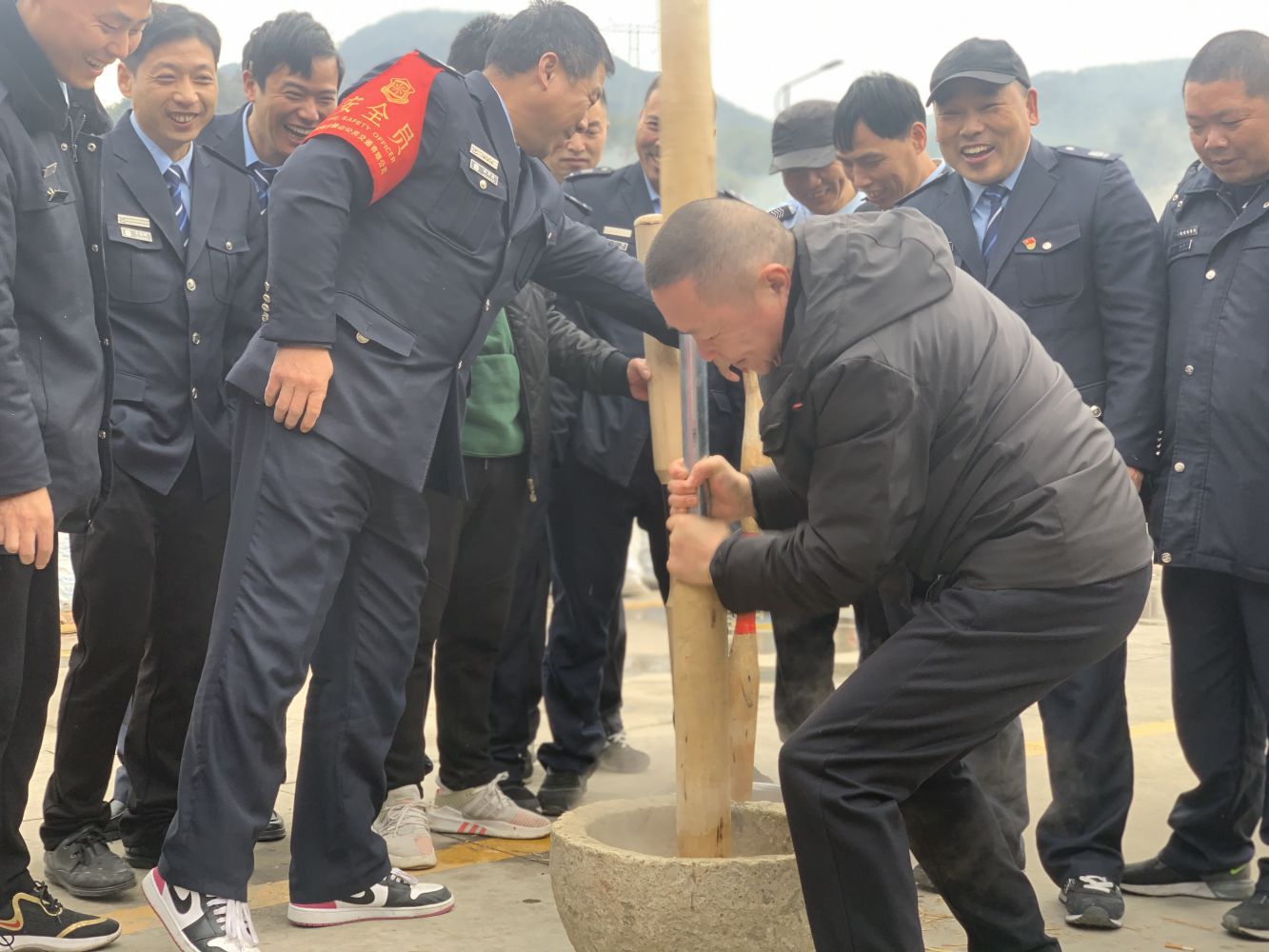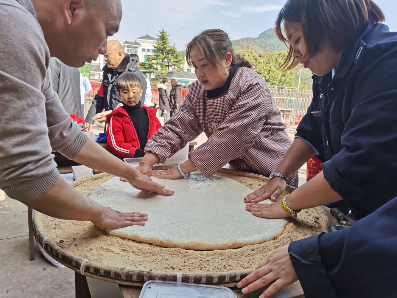 活动现场,大家有说有笑,分工合作,用木蒸笼将糯米蒸好倒入石臼,经过反复碾捶后,再将其铺开剪成一片片小块,裹上芝麻或红糖。咬上一口,软绵绵滑溜溜,糯米的醇和着白糖的甜、艾青的香,带来一种久违的熟悉的传统记忆;附近的村民吃的满口留香,纷纷称赞说:这才是年的味道!