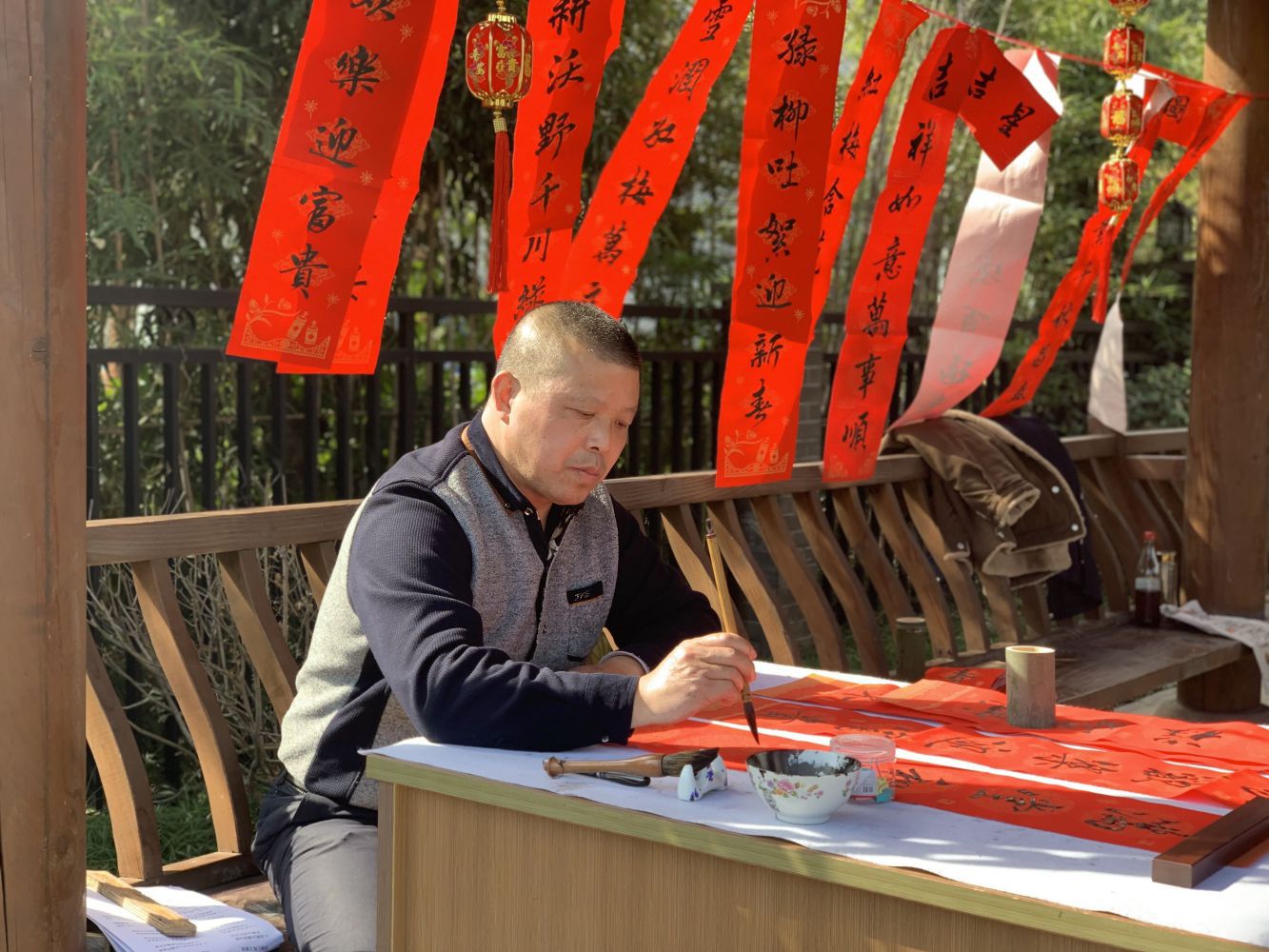 “总把新桃换旧符”,大红的春联福字,寓意着吉祥喜庆,手写春联,则让年味更加正宗。品尝过美味的年食后,公交书法爱好者现场提笔、挥墨泼毫,以苍劲有力的笔法为大家送上了“墨香四溢”的新年祝福,一幅幅满载美好寓意的春联和福字被村民、乘客抢着“惠存”。