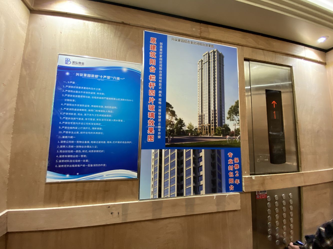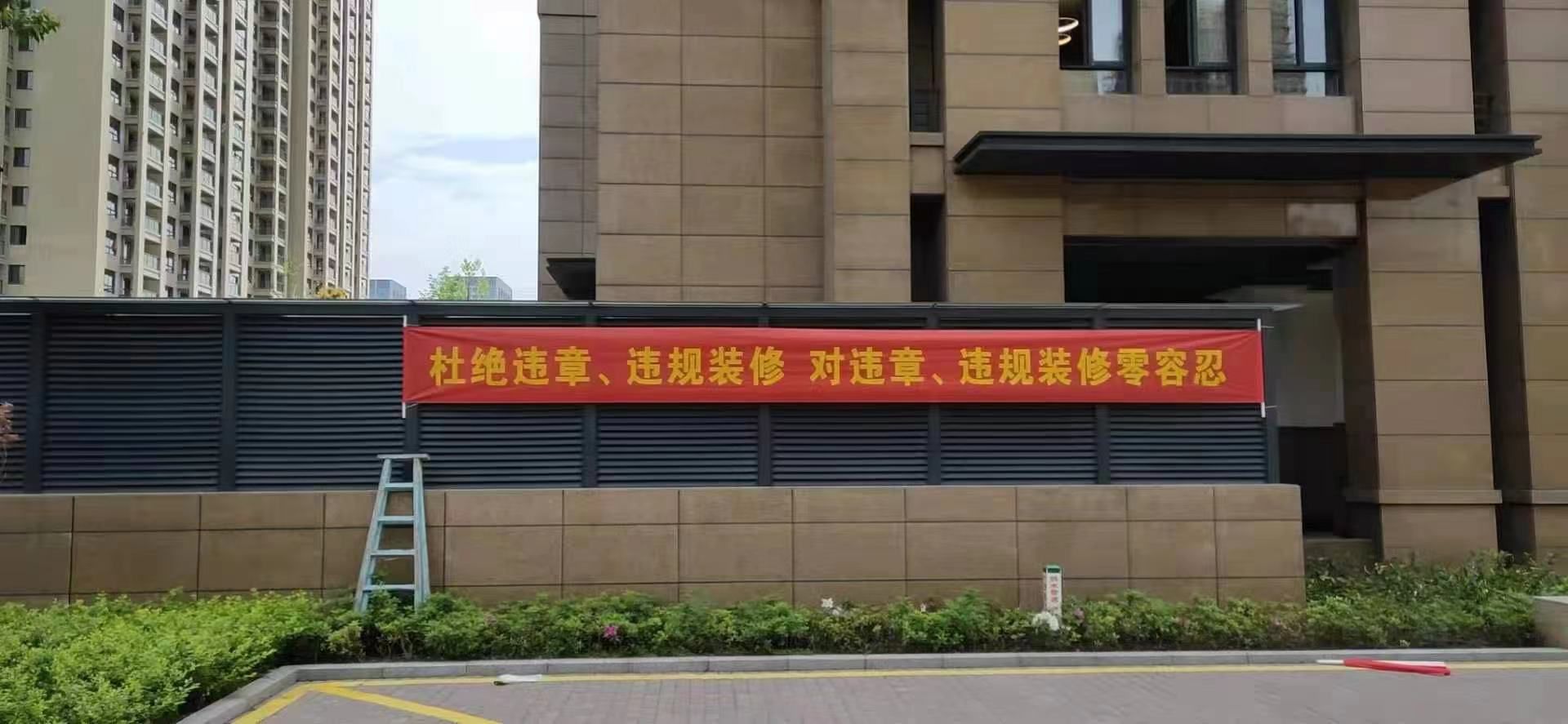 二是为使业主对装修要求家喻户晓,严禁违规操作,违章塔建。物业做了大量的工作(1)在小区显眼处拉横幅作宣传(2)在小区入囗处摆放户型装修示意图,让业主了解装修的要求(3)在电梯轿厢内张帖“10严禁”“6统一”要求,让业主清楚明白哪些可以,哪些严禁的。