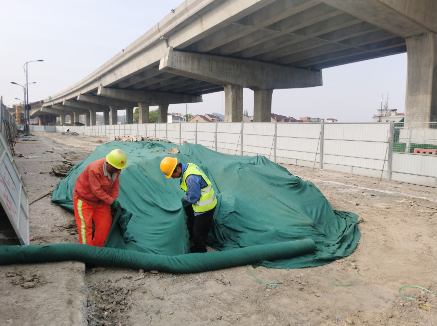 公司当前在建的均为线性工程,不便于集中管控,给扬尘管控带来一定困难,尤其是03省道高架南延及时代大道边通车边施工,存在车流量大、路况复杂、交叉施工等问题,为此我们成立了扬尘防治、裸土控制及文明施工专项领导小组,编制了各项目扬尘专项方案,落实了扬尘专项管理人员。结合日常检查情况,公司不定期组织专项检查,对存在扬尘问题进行通报,督促施工单位进行整改,同时利用视频监控、无人机进行环境整治实时监督,委托专业养护单位——萧山路桥公司对施工围挡以外进行保洁养护,大大提高了扬尘管控。对于问题突出的项目重点关注,并与当地乡镇街道相互联动及时处置,建立长久有效的扬尘污染防治工作机制。