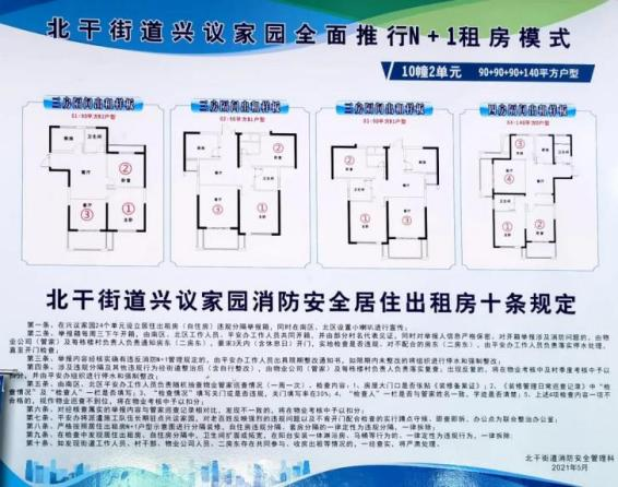针对兴议家园安置房装修前期管控,滨弘物业编制了兴议家园装修“十严禁”“六统一”管理条例,并将装修管理条例、样板模式贴在每栋楼的电梯里,北干街道出台《北干街道兴议家园全面推行N+1租房模式及消防安全居住出租房十条规定》,筑牢出租房消防安全“防火墙”。