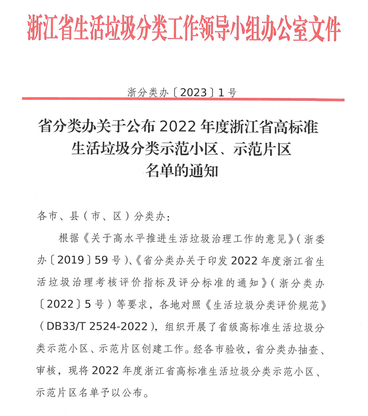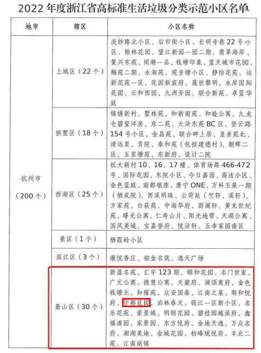 浙江省生活垃圾分类工作领导小组办公室公布《2022年度浙江省高标准生活垃圾分类示范小区名单》,滨弘物业宁都花园项目榜上有名!