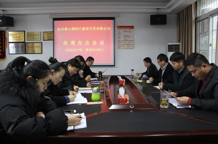 2018年1月2日,元旦假期结束的第一天,浦阳江开发公司召开经理办公会议,专题总结2017年全年的工作成绩和经验,分析当前公司面临的形势,查找工作中存在的不足,明确公司在2018年的工作任务和发展目标,公司班子成员、部门负责人、工青妇负责人参加了本次会议。会上,公司部门和工青妇负责人分别汇报了2017年的成绩及2018年的工作思路,反思了工作存在的问题,班子领导对工作方向进行布置和安排。最后,韩总对2018年公司各项目标任务进行明确,并提出了全局观念、责任担当、工作有计划、团结协作、做最好的自己、廉洁自律六方面的要求。