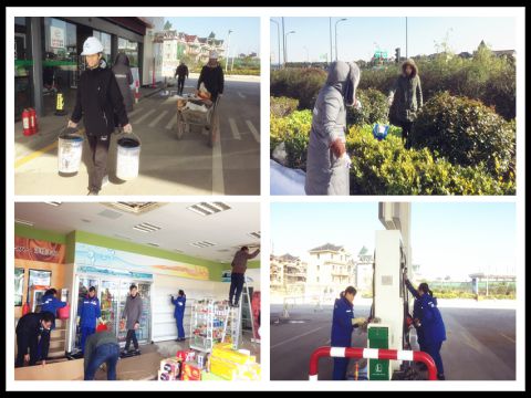 公司班子领导亲自带头,大家分工有序、干劲十足,分别擦拭了加油机和便利店玻璃、货柜和门头,清理了加油现场、油罐区和周围绿化带。经过一个下午的打扫,北站焕然一新。
