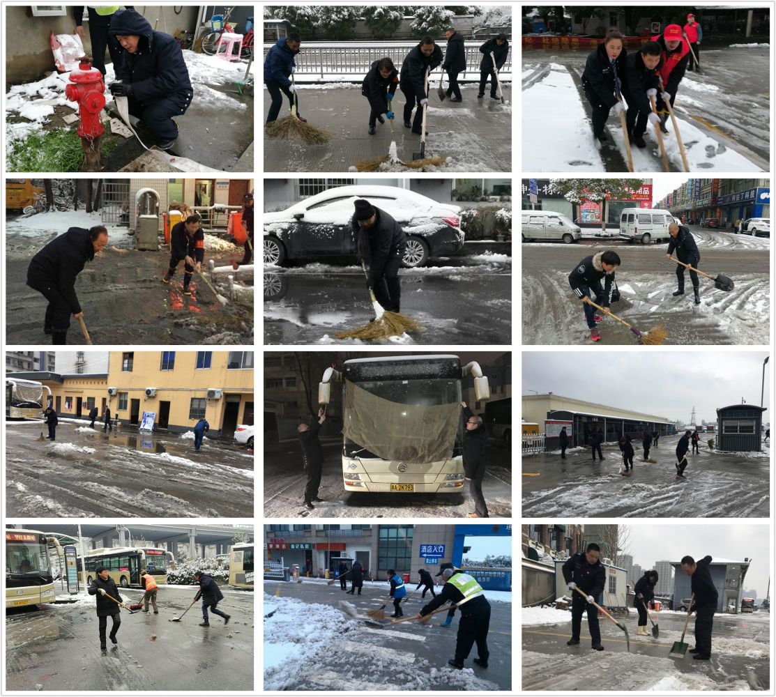 参加抗冰雪任务的不仅有各级管理干部,还有来自各个部室、车队、分公司、管理中心的一线司机、A3司机学员、站员、站场保安、物业人员、修理工、公共自行车值守人员、党团突击队队员等。参加抗冰雪任务的员工中,有些是自愿放弃休息时间的,有些是主动申请调班至今天的,有些是凌晨4时就走出家门从距离城区40公里远的东片、南片乡镇赶来支援的,还有一些身患重流感高烧39度依然冲锋陷阵的。室外气温低至零下,寒风一遍遍吹干大家脸颊上的汗水,手套湿了又干,干了又湿,换了又换,但大家的抗击热情只增不减,越战越勇。特殊时期彰显公交本色,关键时刻尽显责任担当。大家心往一处想,劲往一处使,拧成一股绳,积极面对这场抗击冰雪的硬仗,确保在冰冻来临前清理完所有场站的积雪。
