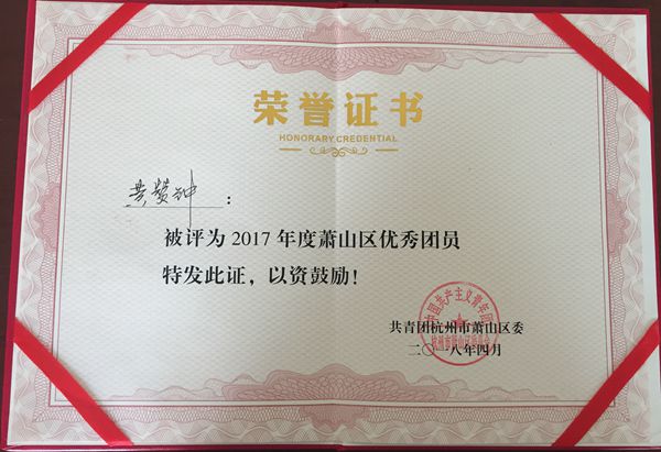 近日,长运修理分公司黄赞钟同志荣获共青团杭州市萧山区委授予的“2017年度萧山区优秀团员”称号。