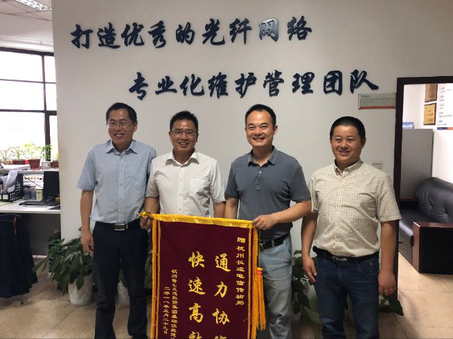 5月31日,杭州萧山交通投资集团基础设施建设指挥部指挥长杨卫军、副指挥长邱国锋赠送锦旗答谢杭州长途电信传输局对我单位工作的支持配合,希望双方在今后的工作中,加强联系,保持沟通,确保双方工作顺利开展。