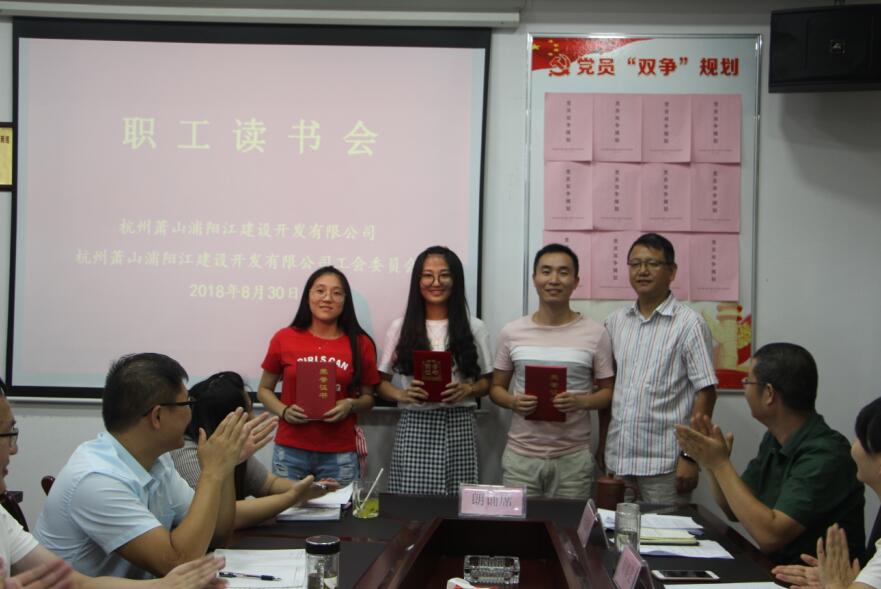 为激发职工读书兴趣,开拓广阔视野,促进职工个性特长发展,创建学习型企业文化,8月30日下午,浦阳江开发公司工会组织开展职工读书会活动。本次读书会共三个环节。环节一为美文朗诵,职工们将自己喜欢的片段通过诵读的方式与大家交流;环节二为猜书名,职工们阅读PPT中的句子,从选项中选出正确答案,在紧张而又刺激的抢答中,现场气氛空前热烈;环节三为书单推荐,工会向职工推荐精选书单,要求职工读好书,并做到学有所悟。