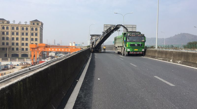 在开工仪式后,03省道东复线高架南延工程第3合同段马上进入桥梁拆除作业的沥青路面铣刨工作。