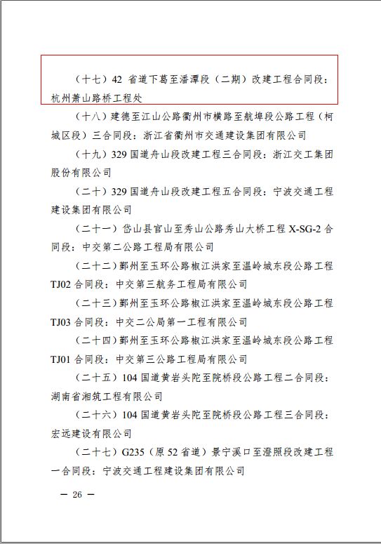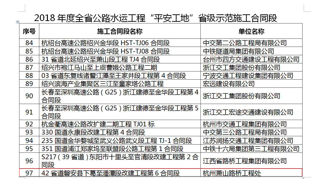2月中旬,萧山路桥工程处捷报频传,在省交通厅公布的关于2018年度全省高速公路和普通国省道项目检查情况与“平安工地”评价结果通报中,有集团下属单位萧山路桥工程处施工的42省道下葛至潘潭段(二期)建设项目先后喜获三项荣誉:2018年度国省道建设施工标准化优秀项目部、2018年度国省道建设信用管理优秀项目部、2018年度全省公路水运工程“平安工地”。