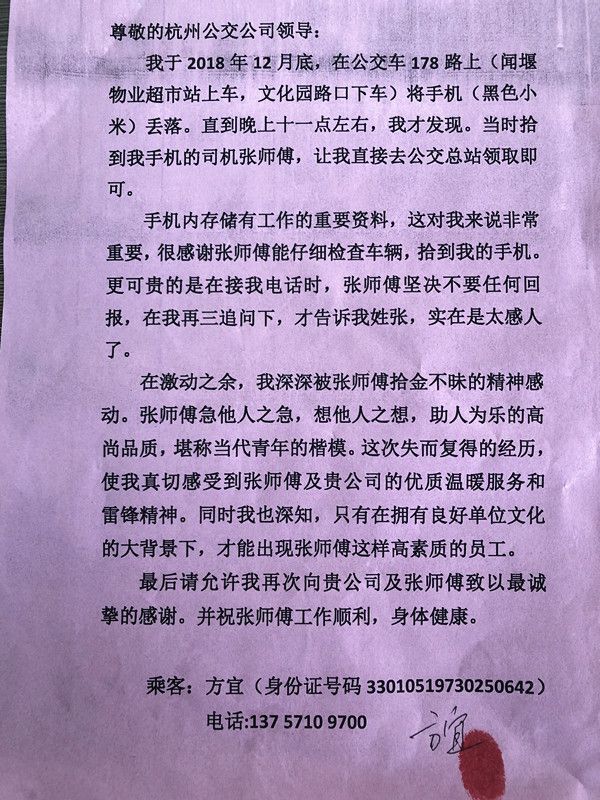 方先生说:当天拿回手机后就忙于工作,把这件事情忘记了,刚好近日坐车又碰到了张仁亮师傅,才让他突然又想起来去年拾金不昧的事迹,连忙写了一封感谢信交给了车队,特地来感谢张师傅及公交公司的优质温暖服务和雷锋精神。同时,方先生也感慨,只有在拥有良好企业文化的大背景下,才能培养出张师傅这样品德高素质高的员工,能够受到这样公司的服务,是老百姓的福气。