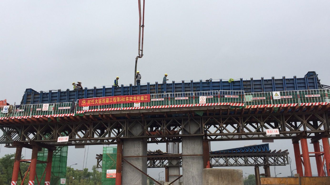 4月23日,时代大道改建工程第3标段施工现场横幅高挂,斗志昂扬,于中午11点开始对首件185#墩盖梁混凝土进行浇筑,打响了第3标段主线盖梁施工的第一枪。
