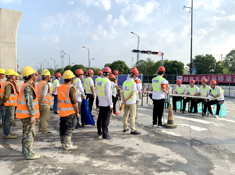 6月24日下午,时代大道改建工程组织开展高空坠落应急演练活动,项目部全体人员及各施工班组参加。