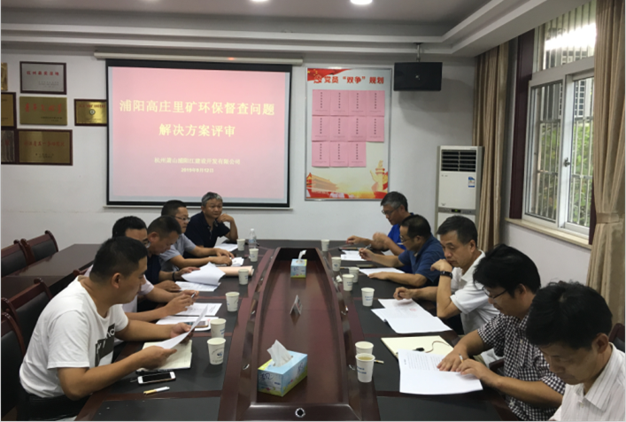 9月12日下午,浦阳镇高庄里矿环保督查问题解决方案专家评审会召开,邀请到了区规划和自然资源分局、五名省级专家以及施工、监理单位有关负责人参加此次。专家组一行到浦阳镇高庄里矿进行实地踏勘,并在浦阳江开发公司一楼会议室召开环保督查问题解决方案专家评审会。会上,浦阳江开发公司副总经理金清华就高庄里矿环保督查存在问题进行阐述,施工单位就如何落实好相关环保问题进行详细介绍。随后经专家组讨论磋商,一致通过了解决方案,并形成了专家组评审意见。最后专家组强调,环保问题要从源头抓起,做到过程管控。此次矿山评审,以改善矿区生态环境和群众生活环境为出发点,以提升矿山环保和安全管理水平为着力点,探索集中治理与长效管理相结合的方案,确保治理工作出实效。