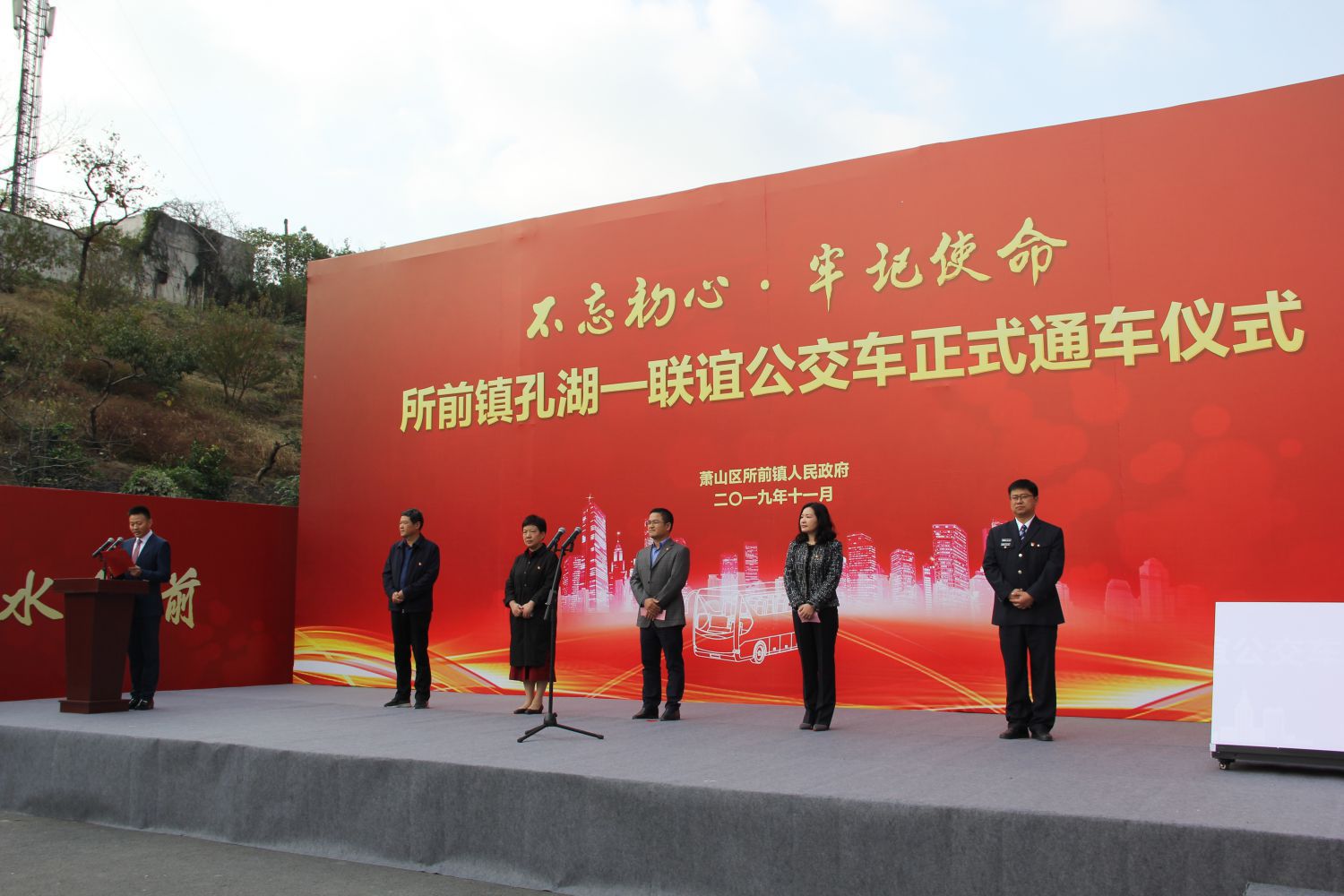 11月8日上午,新线开通仪式在所前镇孔湖村隆重举行,所前镇党委书记裘荣校,镇党委副书记、镇长来巧玲,镇人大主席金宝荣,区交通运输局党委委员、副局长、运管处主任步苏琴等领导,萧山公交党委副书记、董事长、总经理张国栋等公司班子及区镇相关人员参加仪式。