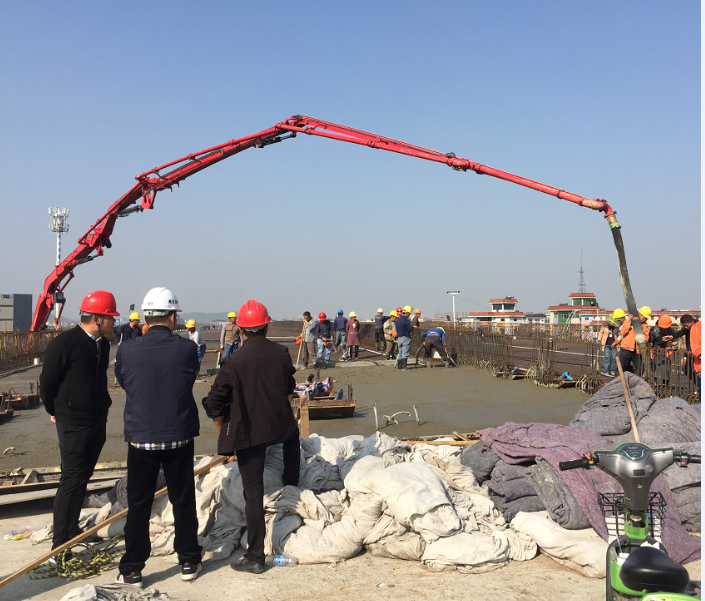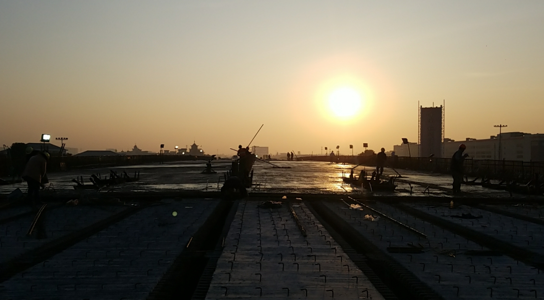 此处箱梁顶板于11月9日上午8时开始浇筑,邀请了监理办和设计院监督、指导,并配备现场质检员、现场安全员、试验员、电工、收料员、支架监控等28名工作人员,实行24小时工作制,在工作人员两天一夜的辛苦忙碌、用掉1524方砼之后于10号下午5点正式结束。
