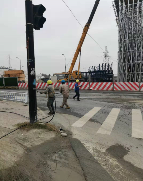为加快工程施工进度,配合相关征迁需求,2019年11月22日上午8时,湘湖电力营业所与萧山中新电力承装公司派工对时代大道改建工程亚太路小砾A265线架空线进行停电割接作业,上午10时完成停电割接工作。由于此路段车流量大,电力停电割接后续的下线工作存在一定难度,在第三项目部的密切配合下,对该路段进行临时封道措施。电力承装公司对架空线进行拆除收线工作,截止上午10点半,亚太路小砾A165线上改下全部完成,为时代大道166#主墩施工扫清了障碍,消除了一大施工安全隐患。