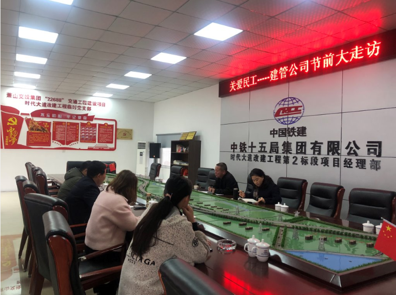 1月10日,交通建管公司党支部书记杨涌、工会主席王国芳对红十五线改建工程、03东复线高架南延工程、03省道萧山义桥至楼塔段改建工程、时代大道改建工程四个项目召开了一场“关爱民工——建管公司节前大走访”的座谈会,对年前民工返乡情况进行详细了解。
