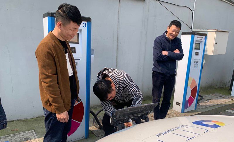 4月12日上午,新能源汽车公司充电桩业务上线试运营,集团党委委员、副总经理、公司董事长韩朋朋,视察充电桩试运营第一天的使用情况,新能源汽车公司相关工作人员陪同。