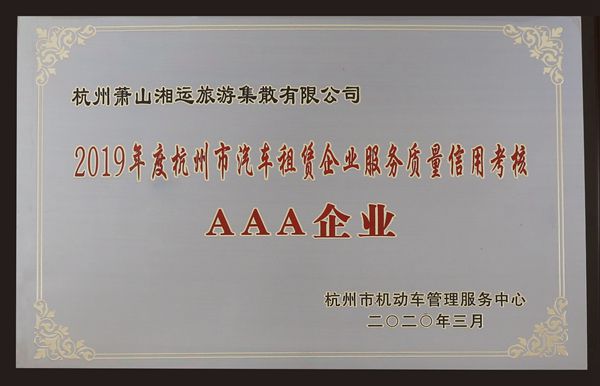 近日,长运公司下属湘旅公司喜获由杭州市机动车管理服务中心授予的“2019年度杭州市汽车租赁企业服务质量信用考核AAA企业”荣誉称号。