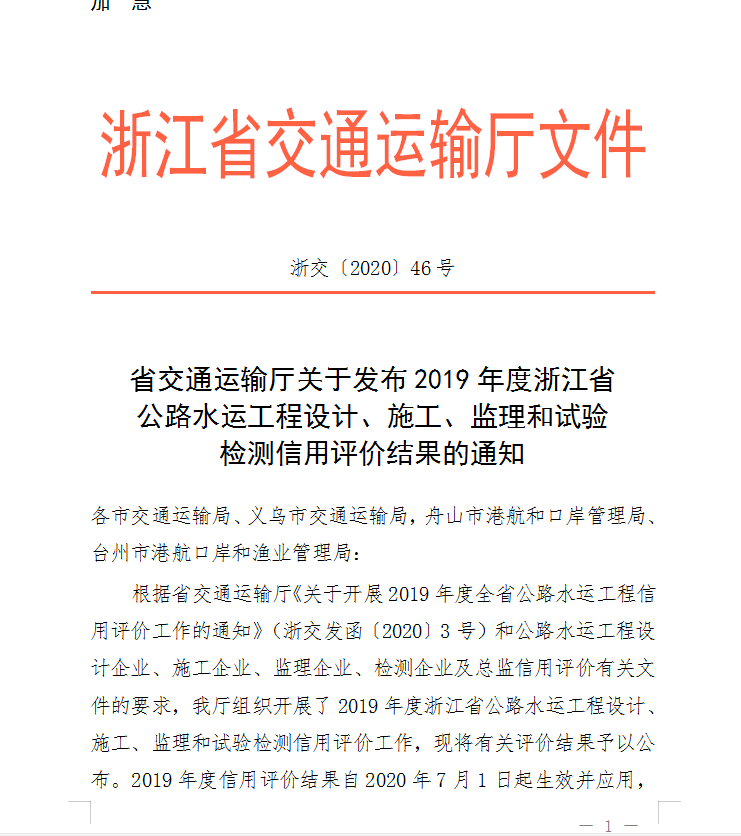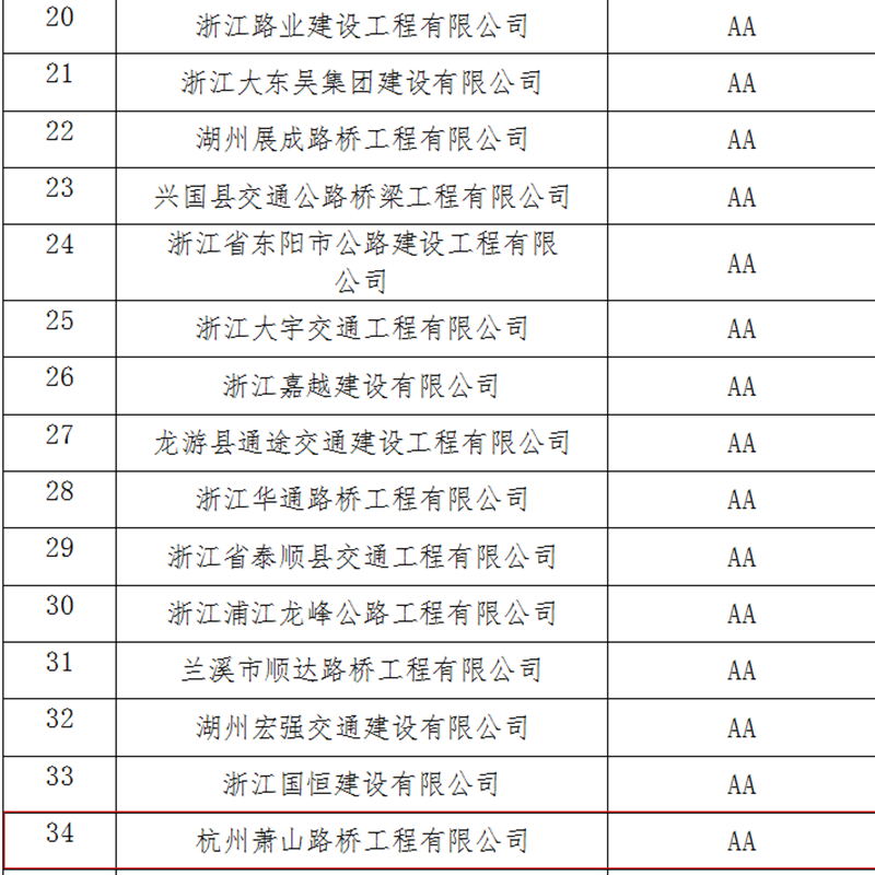 根据浙交[2020]46号文件发布的2019年度浙江公路水运工程设计、施工、监理和试验检测信用评价结果,萧山路桥工程有限公司获评2019年度浙江省施工企业信用评价AA级,这也是公司自2006年省交通运输厅开展施工信用评价以来,第12个年度被评为AA级信用企业。