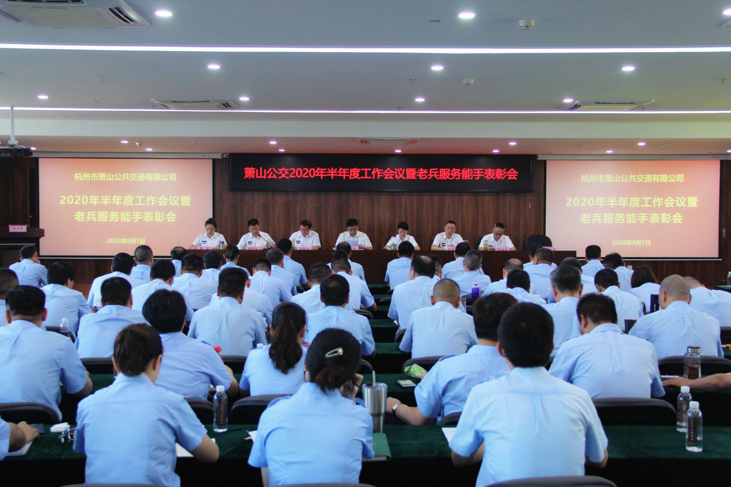 为分析总结公司上半年经营情况,部署下半年目标任务,同时进一步树立典型、表彰先进,充分发挥退伍军人示范引领作用,“八一”建军节之际,萧山公交在总部五楼会议室隆重召开2020年半年度工作会议暨老兵服务能手表彰大会,公司全体班子、全体中层干部、老兵先进个人共110余人参加会议。