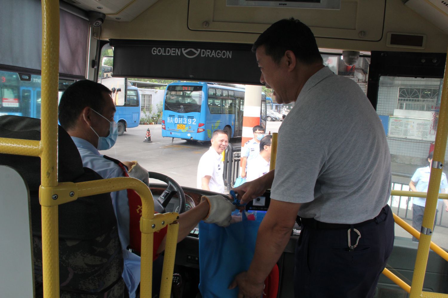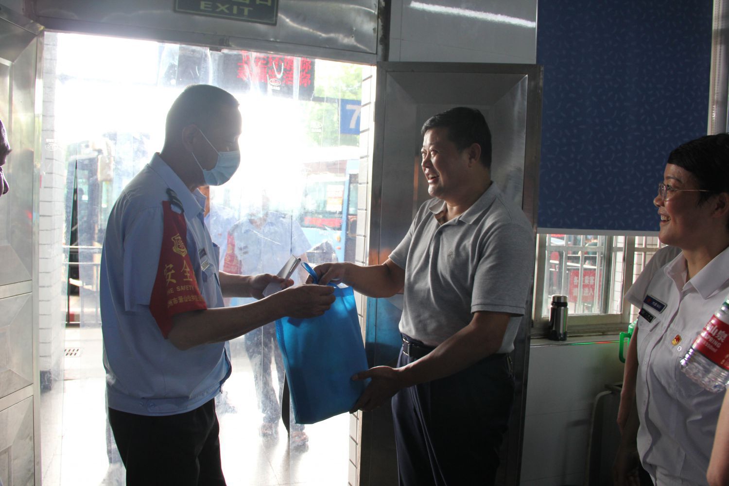 在通惠路公交站,集团领导走进车厢、站房,将防暑降温用品送到一线职工手中,对大家在高温天气下依然坚守岗位、敬业奉献表达了敬意和感谢。领导们仔细询问了一线职工的生产生活情况,再三叮嘱大家要合理安排好作息时间,避免过度劳累,注重劳逸结合,在完成工作的同时,做好防暑降温工作和防疫措施,确保安全作业。