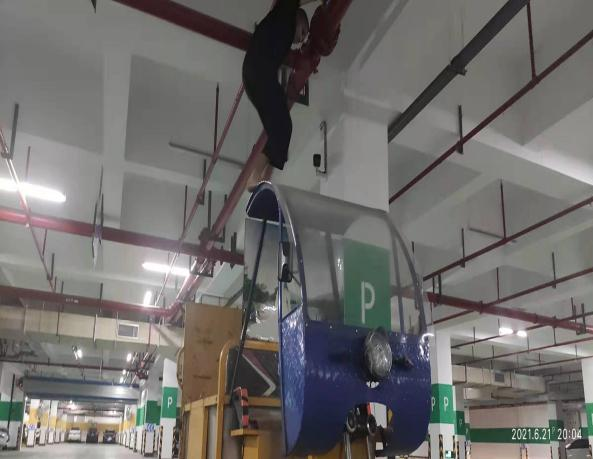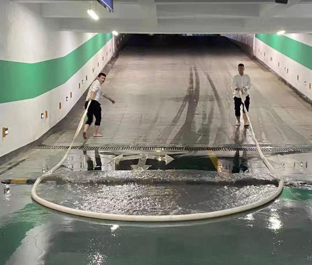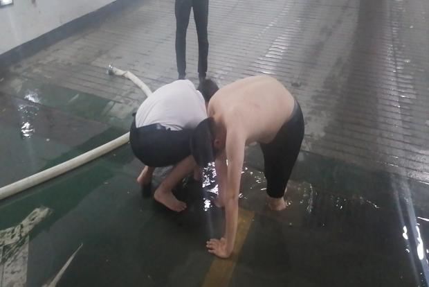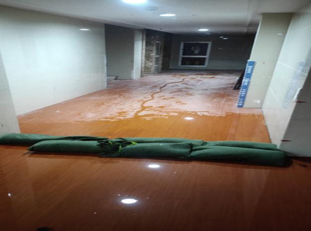 秩序部队员第一时间到达点位,确认8幢B2地库单元门口通道消防喷淋被撞坏,水流飞溅。现场秩序员立即汇报受损情况及响应应急预案,现场大面积积水并且水势走向已流往电梯厅方向,紧急采取沙袋堵流确保电梯设备不受侵害。应急响应小组总指挥张磊带领各小组赶赴现场指挥救援。工程小组对喷淋各路管网止水阀进行关闭减少受损面积及经济损失,对损坏消防喷淋利用水带引流至下水井;秩序小组利用消防水带包围积水区域拖至下水井,因水流过大,秩序组人员不惧湿身多次下井疏通堵塞井道,确保排水顺畅,同时控制肇事货车并做好相关信息记录。