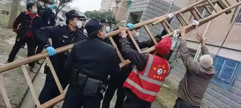 物业保安员施杏荣和陈校庆听到消息后,第一时间赶到了现场,两人在轮换尝试多次后,也未能将门打开。9:43警察同志赶到现场,在一番确认后,警察同志一时间也束手无策,只能寻找开锁师傅进行开锁,但现场情况十分紧急,等开锁师傅到来,可能事故已经发生。在短暂商讨过后,物业工作人员迅速跑去抬登梯,取得登梯后绿化师傅孙建松迅速爬上防盗窗,在业主、警察同志和物业工作人员的齐心协力下成功化解了此次危机。