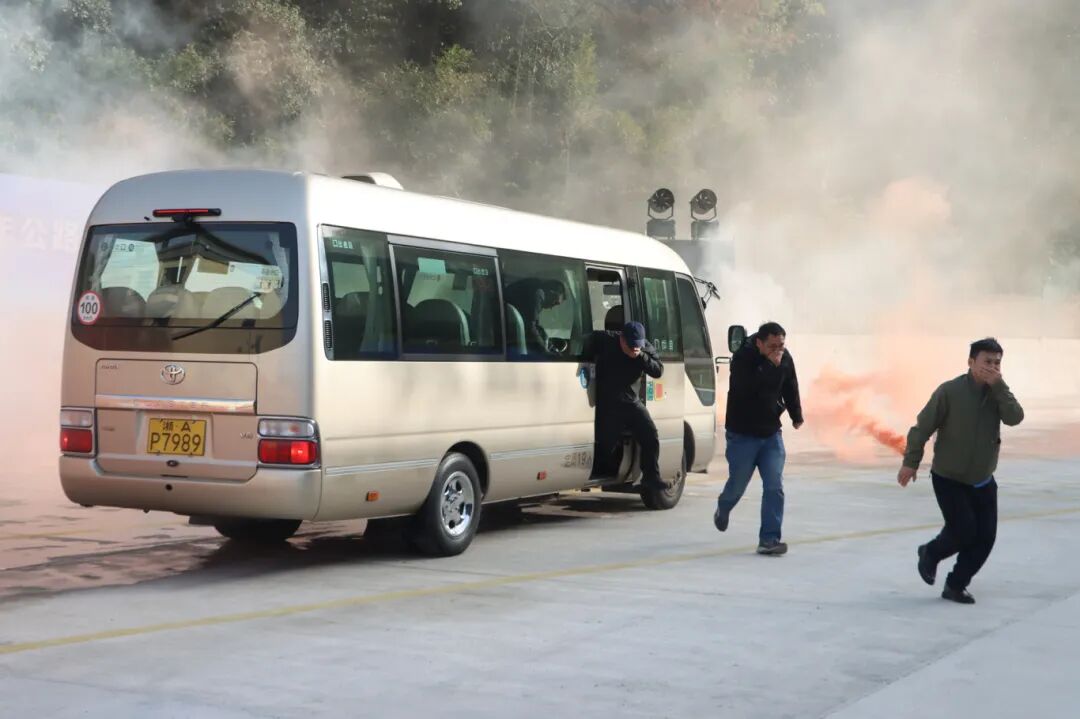 最后一项是消防应急逃生演练,演练模拟中巴车起火、人员被困场景,以“任务接收、队伍出动、灭火救援、有序撤离”四个流程设置演练内容,同时配合公路交通、公安交警、消防救援、医疗救援等多部门应急联动,整个演练过程紧张有序,参演人员表现出了良好的应急逃生意识和自救互救能力。