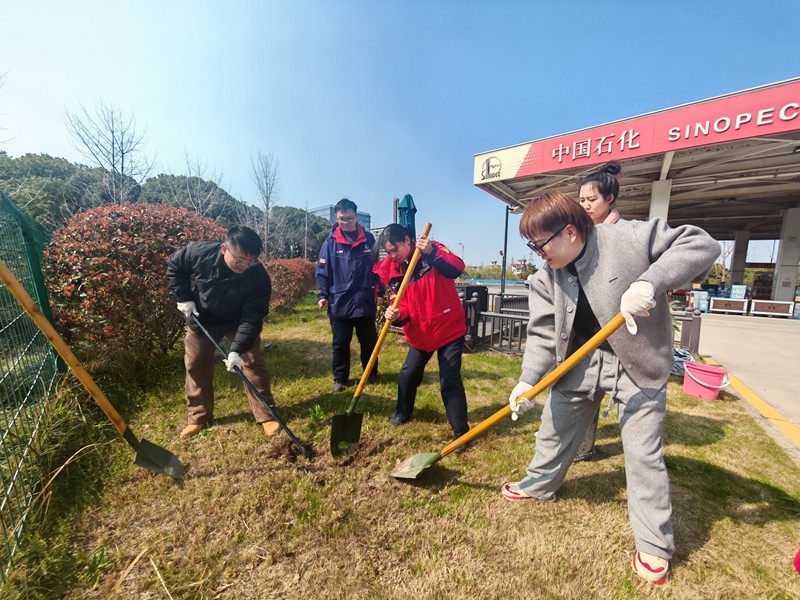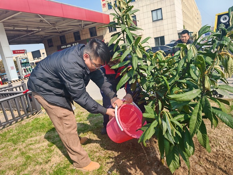 现场,大家分工协作,挥锹挖坑、扶苗培土、浇水定根,将树苗植入站区空地,为加油站添上盎然春意。活动中,大家还结合岗位畅谈低碳理念,把环保初心融入日常服务。