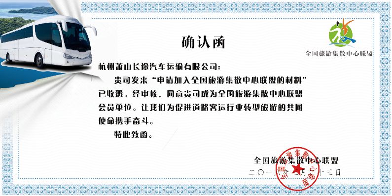 3月30日上午,全国旅游集散中心联盟发来函告,同意杭州萧山长途汽车运输有限公司成为全国旅游集散中心联盟会员单位,自此,长运公司将作为旅游联盟的一份子,为促进客运行业转型旅游的使命而奋斗。