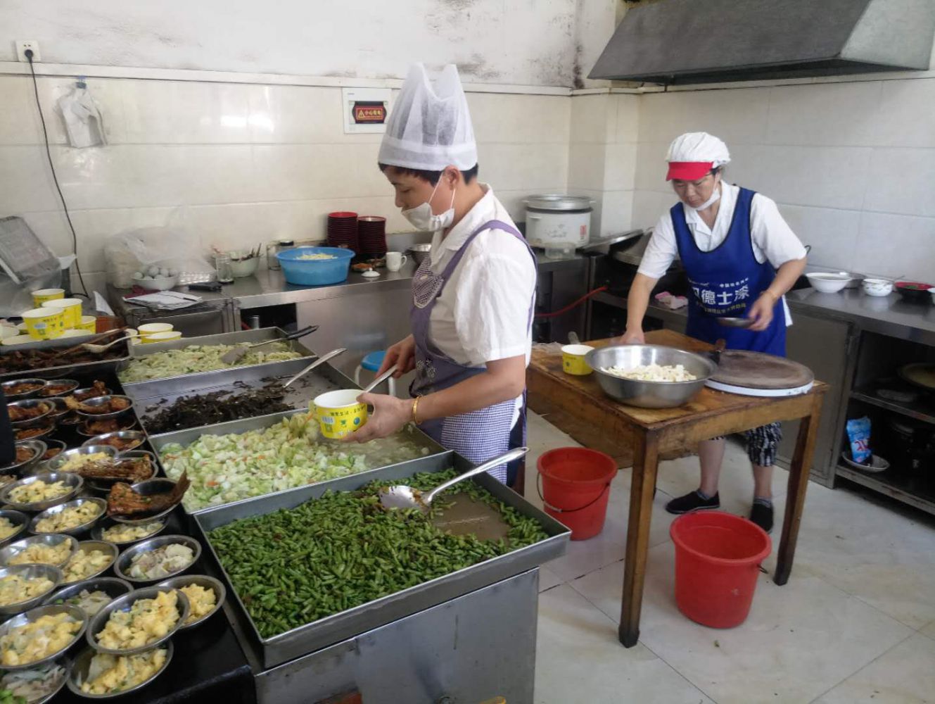 兴冲冲去打饭,厨房操作间里还在乒乒乓乓,大锅里翻炒着什么我看不清。就看到带着袖筒的大姐拿着两个锅铲左右开工。炉灶的火光隐约可见,打饭窗口热气铺面。抬头看见一双微笑的眼睛,打菜的大姐穿着完整的厨房工作服正在等我点餐。额间的汗水打湿了帽檐,围裙绑带处早就汗湿。因为想到要写通讯稿,打算采集点素材,对着大姐拍照,她摇手拒绝了。也许我该出其不意的拍下敬业的画面。