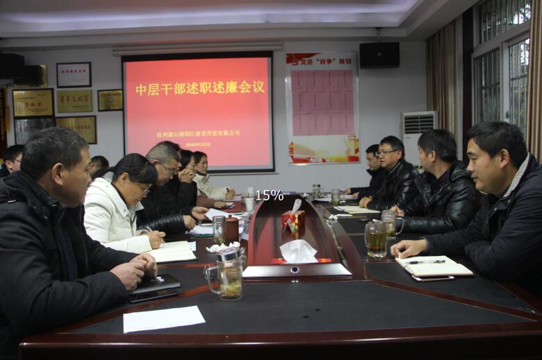 1月2日下午,浦阳江开发公司召开中层干部述职述廉工作会议,公司中层副职以上干部、工青妇负责人及群众代表参加。会上,各位中层干部作了个人述职述廉报告,随后全体与会人员进行了民主测评,客观、公正、准确地考核公司中层干部德、能、勤、绩、廉等方面的现实表现和履职情况。公司党支部书记王光明传达了祝董事长在集团中层干部述职述廉会议上的讲话精神,并根据公司实际,提出三点要求:一要敢担当、有作为,要求中层干部在公司工作需要的时候,能挺身而出,攻难克坚,不推脱责任、不回避困难、不转移压力;二要讲政治、顾大局,要着眼全局,站公司的立场、员工的立场,发挥好桥梁和纽带作用,积极向身边的员工传播正能量;三要抓落实、讲奉献,要朝着既定目标,一件一件干工作,一步一个脚印抓落实,杜绝纸上谈兵、流于形式。