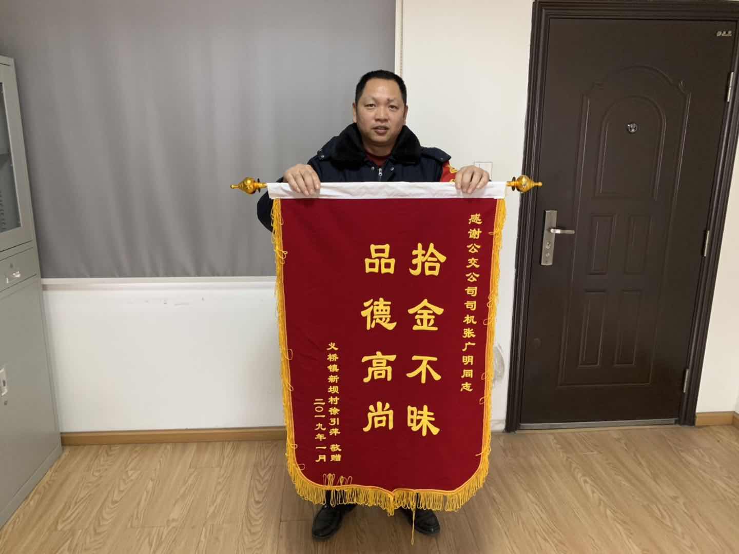 年关将至,失而复得应该是最开心的事情了吧?近日萧山公交六车队义桥站站房里急匆匆进来一位女士,手里还拿着一卷锦旗,原来是来感谢719路司机张广明师傅金不昧的善举。1月23日那天,市民徐女士乘坐719路公交到义桥站下车,由于赶时间,就忘记了钱包放在了身旁便急匆匆下了车,张师傅营运结束后做巡检时发现座位上有一个钱包,便马上上交站员,经查,内有现金四千余元、还有重要证件若干。于是马上通过卡上的信息和站员及时找到了失主,徐女士当天就来领走了失物,今天特地送来锦旗再次当面感谢张师傅。