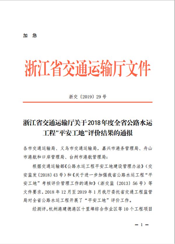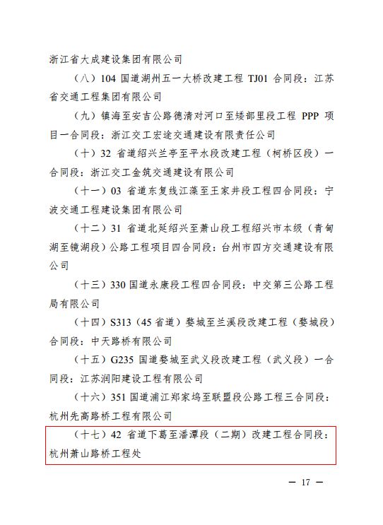 2月中旬,萧山路桥工程处捷报频传,在省交通厅公布的关于2018年度全省高速公路和普通国省道项目检查情况与“平安工地”评价结果通报中,有集团下属单位萧山路桥工程处施工的42省道下葛至潘潭段(二期)建设项目先后喜获三项荣誉:2018年度国省道建设施工标准化优秀项目部、2018年度国省道建设信用管理优秀项目部、2018年度全省公路水运工程“平安工地”。
