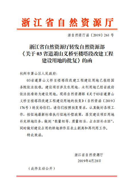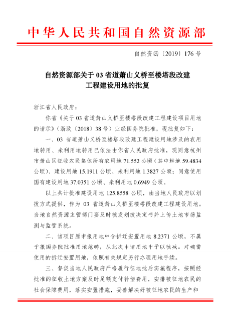 近日,获悉自然资源部正式批复03省道萧山义桥至楼塔段改建工程用地审批意见书(自然资函[2019]176号),这为合法使用工程建设用地,确保工程顺利开工建设打下了基础。