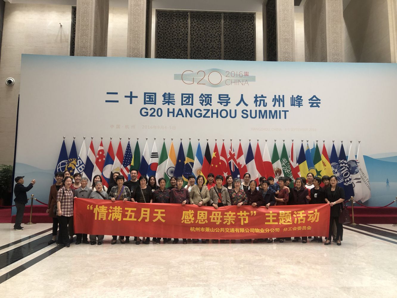 上午9时许,分工会优秀职工代表与母亲在通惠路公交站集合,一同乘坐旅游大巴前往杭州国博中心进行参观。在国博现场,分工会贴心地为大家安排了专业解说员陪同讲解,在迎宾区、在主会场、在宴会区,大家纷纷驻足游览、细听介绍、留影纪念。一个多小时的参观游览,令在场的所有人留下许多美好记忆。母亲们纷纷赞叹说,这里这么大气,又这么精致,真正体现了“大国风范、江南特色、杭州元素”,作为杭州的市民,感到非常自豪。”活动最后,分工会负责人做了总结发言,并代表公司工会提前预祝母亲们节日快乐,活动在一片热烈的掌声中圆满结束。