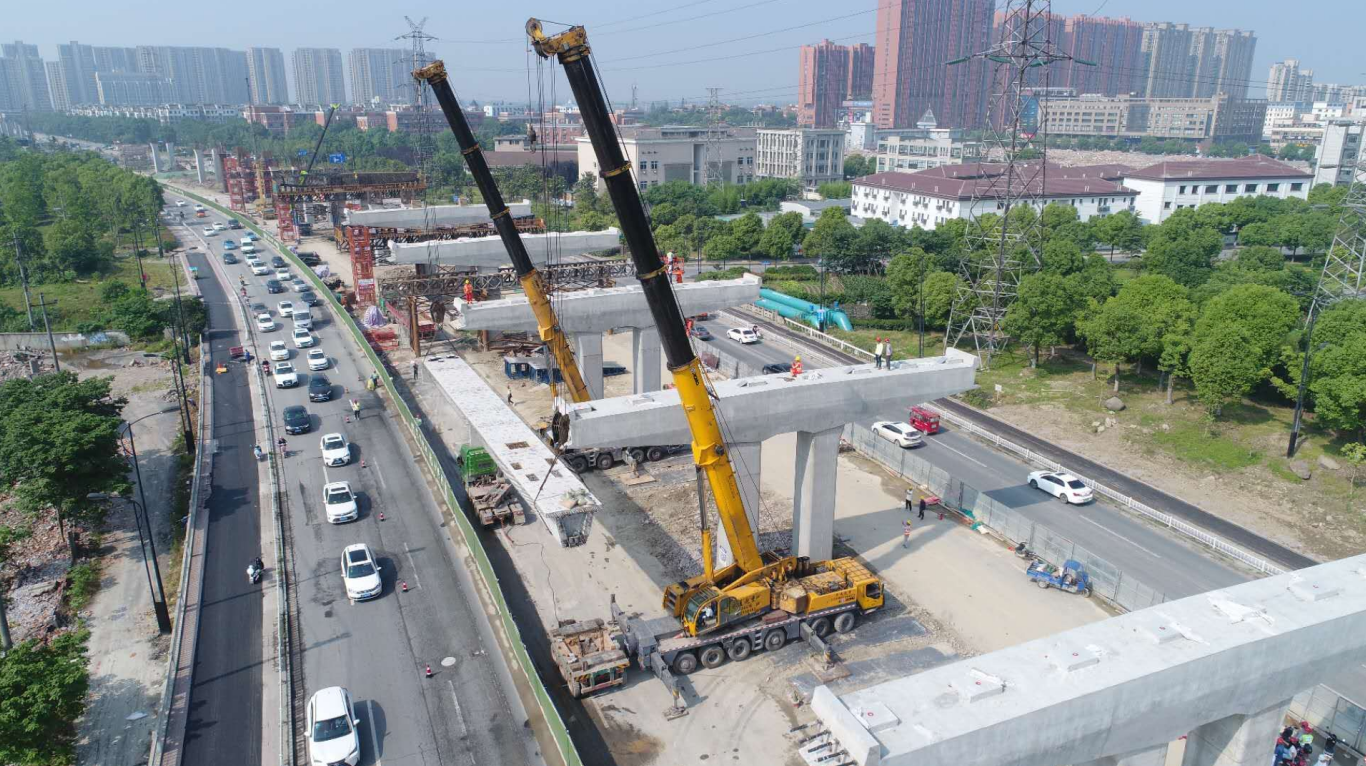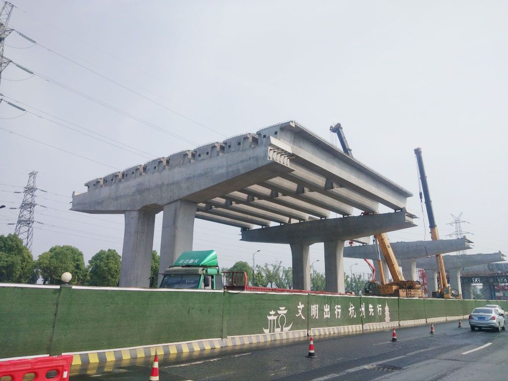 时代大道改建工程全长6595m,共有预制梁板1691片,首跨成功架设的预制梁板长25米,本次计划连续架设梁板3跨,每跨8片,共计24片,计划于6月7号左右完成本次24片梁板架设,并逐步开始连续架设。